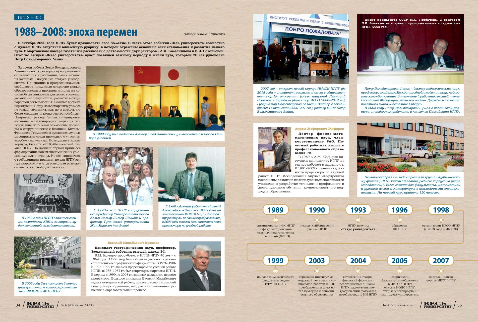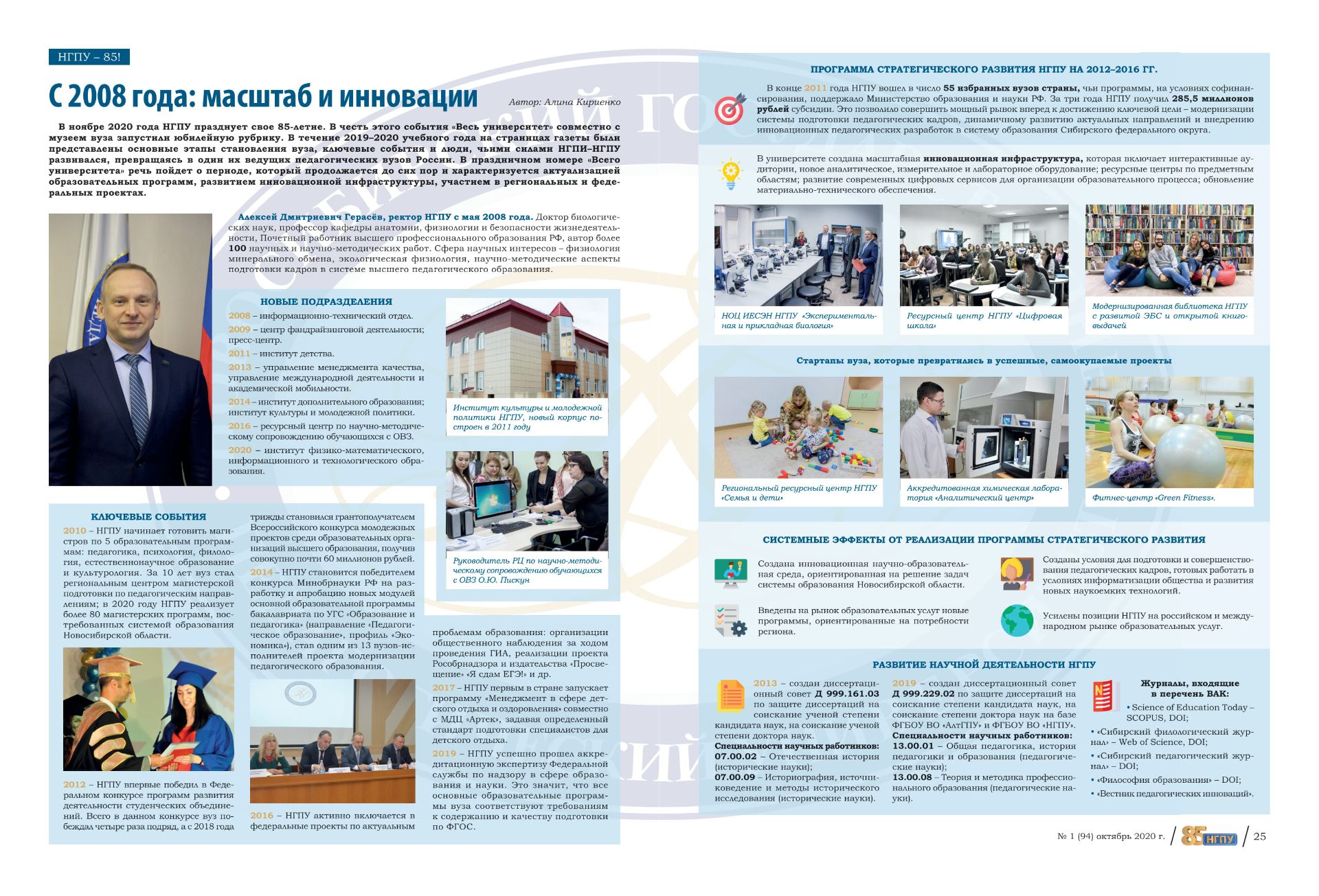 Уважаемые коллеги, поздравляю вас с замечательной датой, 85-летием НГПУ! К юбилею наш вуз подошел с достижениями, которыми по праву может гордиться. Сегодня НГПУ – признанный лидер педагогического образования, входит в пятерку сильнейших педагогических вузов России. История нашего университета, а также его сегодняшняя эффективная работа и амбициозные планы на будущее – результат слаженной работы всего коллектива. В этот праздничный день хочется еще раз выразить благодарность нашим ветеранам, профессорско-преподавательскому составу и всем сотрудникам университета за высочайший профессионализм, трудолюбие и преданность НГПУ.
